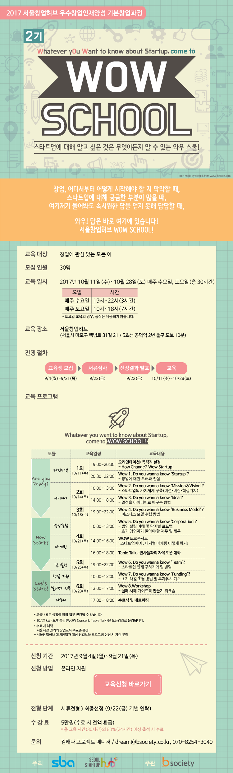 WOW School은 서울시&서울창업허브가 주최하고 비소사이어티가 주관하는 기본창업과정입니다.