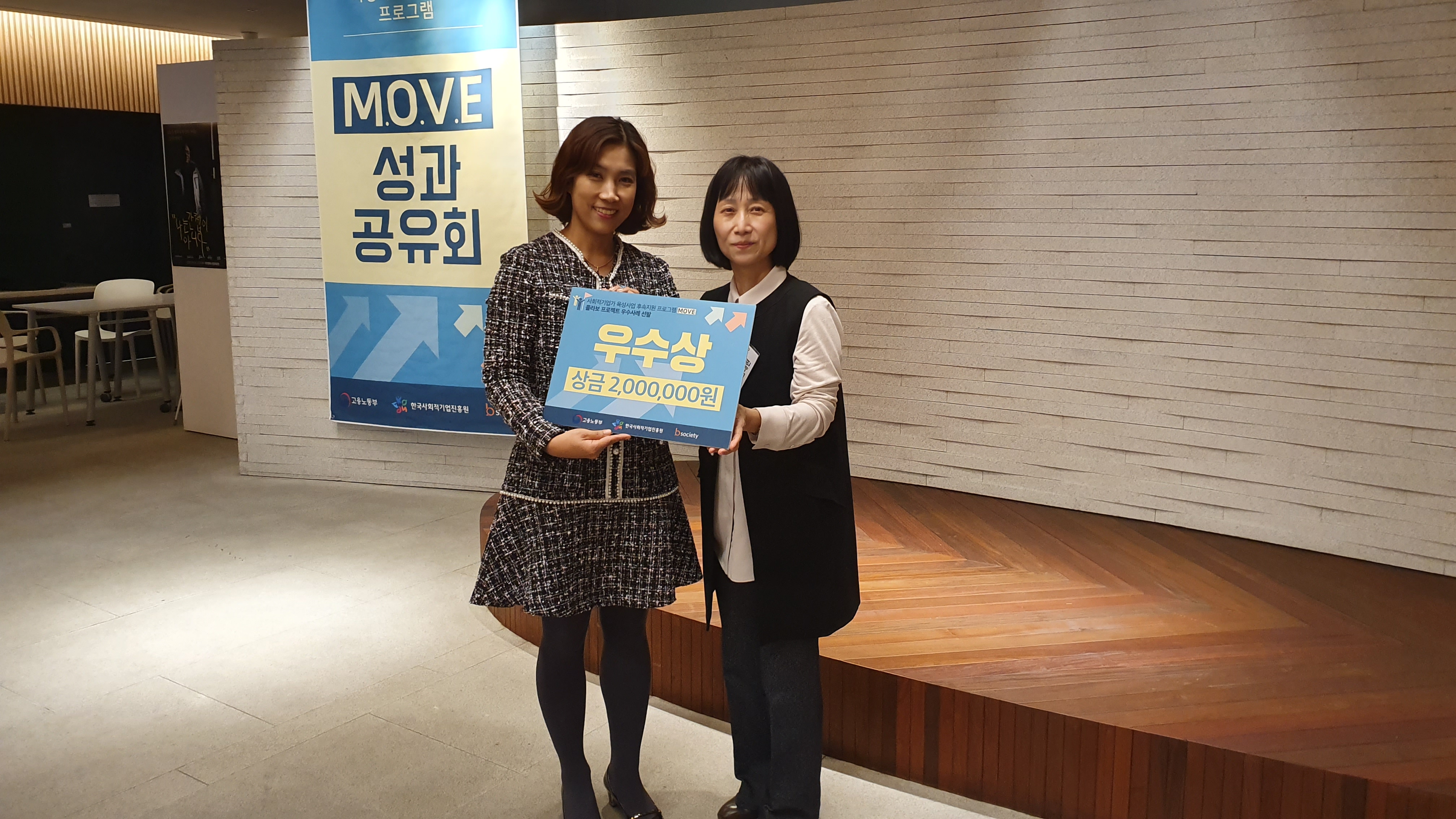 마지막 순서로 진행된 대망의 시상식에서 콜라보 프로젝트 우수사례의 결과가 발표되었습니다. 대상은 ‘ONE-STOP’의 우리에듀&쿠미 그룹에게, 최우수상은 ‘꽃보다 살롱’의 은하수미술관&타오름달 그룹에게 돌아갔습니다. 그리고 ‘우리는 어린이 CEO’ 그룹이 우수상을 받았으며, 장려상은 ‘어디여차’의 어라운드&캔디뮤지컬컴퍼니와 ‘이유있는 해커톤’의 라임프렌즈&만유인력&실버임팩트 두 그룹에게 수여되었습니다. 시상식 후에는 참석자들을 대상으로 경품추첨을 하여 전시를 한 MOVE 기업과 작년 MOVE 기업의 제품을 선물로 주면서 2019 MOVE 성과공유회가 마무리 되었습니다.