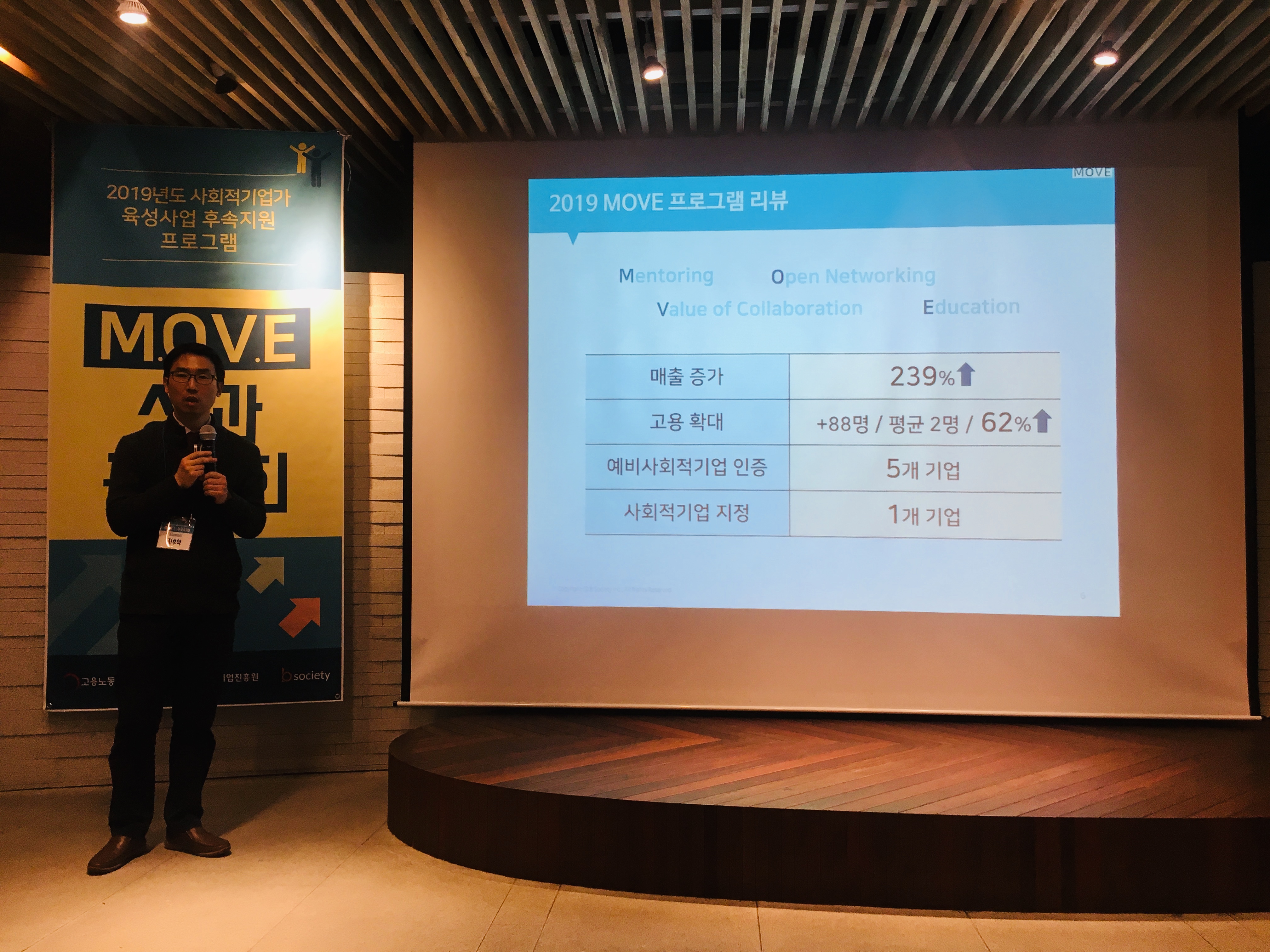 지난 11월 20일, 한국사회적기업진흥원이 주최하고 비소사이어티가 주관하는 2019 사회적기업가 육성사업 후속지원 프로그램 MOVE의 성과공유회가 헤이그라운드 성수시작점의 영감홀에서 진행되었습니다.